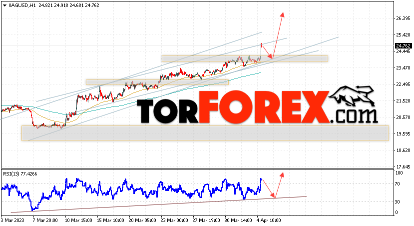Дополнительным сигналом в пользу подъёма котировок и цен на Серебро XAG/USD выступит тест линии поддержки на индикаторе относительной силы (RSI). Вторым сигналом в пользу роста станет отскок от нижней границы бычьего канала. Отменой варианта подъёма цен на Серебро 5 апреля 2023 станет падение и пробой 23.55. Это укажет на пробой области сопротивления и продолжение роста в область выше уровня 17.95. Ожидать ускорения роста котировок XAG/USD стоит с пробоем области сопротивления и закрытием цены над уровнем 25.65, что укажет на пробой верхней границы бычьего канала, а это сигнал к росту на ширину канала.