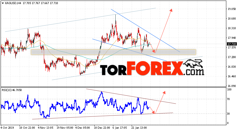 Дополнительным сигналом в пользу роста котировок и цен на Серебро XAG/USD выступит тест области поддержки на индикаторе относительной силы. Вторым сигналом в пользу подъёма станет отскок от нижней границы восходящего канала. Отменой варианта роста цен на Серебро 5 февраля 2020 станет падение и пробой 16.85. Это укажет на пробой области поддержки и продолжение падения в область ниже уровня 16.05. Ожидать ускорения роста котировок XAG/USD стоит с пробоем области сопротивления и закрытием над уровнем 18.05.