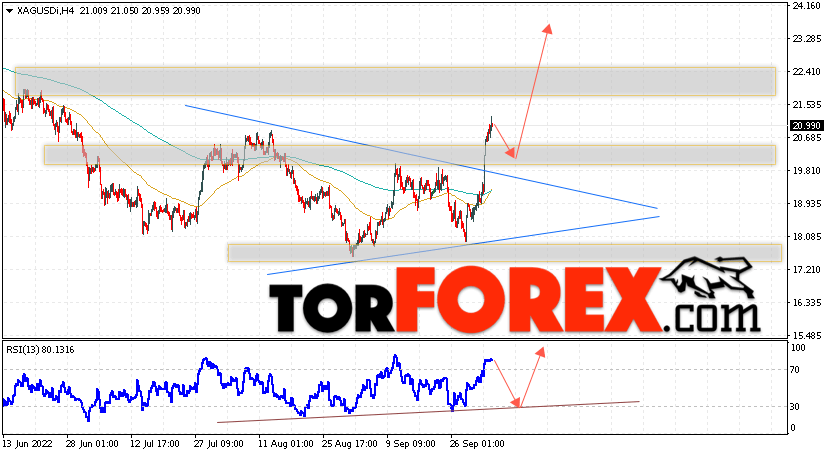 Дополнительным сигналом в пользу роста котировок и цен на Серебро XAG/USD выступит тест линии поддержки на индикаторе относительной силы (RSI). Вторым сигналом в пользу подъёма станет отскок от верхней границы модели ”Треугольник”. Отменой варианта роста цен на Серебро 5 октября 2022 станет падение и пробой 18.05. Это укажет на пробой области поддержки и продолжение падения в область ниже уровня 16.45. Ожидать ускорения роста котировок XAG/USD стоит с пробоем области сопротивления и закрытием цены над уровнем 21.75.