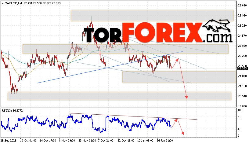 Дополнительным сигналом в пользу падения котировок и цен на Серебро XAG/USD выступит тест линии сопротивления на индикаторе относительной силы (RSI). Вторым сигналом в пользу снижения станет отскок от верхней границы медвежьего канала. Отменой варианта падения цен на Серебро 6 февраля 2024 станет сильный рост и пробой 23.65. Это укажет на пробой области сопротивления и продолжение роста в область выше уровня 26.25. Ожидать ускорения падения котировок XAG/USD стоит с пробоем области поддержки и закрытием цены под уровнем 21.75.