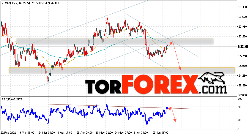 Дополнительным сигналом в пользу снижения котировок и цен на Серебро XAG/USD выступит тест линии сопротивления на индикаторе относительной силы (RSI). Вторым сигналом в пользу падения станет отскок от верхней границы нисходящего канала. Отменой варианта снижения цен на Серебро 6 июля 2021 станет сильный рост и пробой 27.65. Это укажет на пробой области сопротивления и продолжение подъёма в область выше уровня 32.25. Ожидать ускорения падения котировок XAG/USD стоит с пробоем области поддержки и закрытием цены под уровнем 25.05.