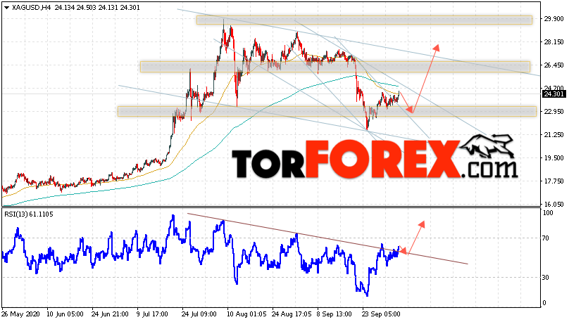 Дополнительным сигналом в пользу подъёма котировок и цен на Серебро XAG/USD выступит тест пробитой линии сопротивления на индикаторе относительной силы. Вторым сигналом в пользу подъёма станет отскок от верхней границы нисходящего канала. Отменой варианта роста цен на Серебро 6 октября 2020 станет сильный рост и пробой 22.45. Это укажет на пробой области поддержки и продолжение падения в область ниже уровня 20.35. Ожидать ускорения роста котировок XAG/USD стоит с пробоем области сопротивления и закрытием цен над уровнем 25.45, что укажет на пробой верхней границы нисходящего канала.