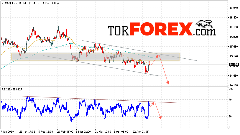 Таким образом, Серебро прогноз и аналитика XAG/USD на 7 мая 2019 предполагает попытку теста области сопротивления вблизи уровня 15.15. Далее, продолжение падения котировок с целью ниже уровня 14.15. Отменой варианта падения цен на Серебра выступит сильный рост и пробой уровня 15.25. Это укажет на пробой верхней границы канала. В этом случае стоит ожидать продолжения подъёма цен выше уровня 15.85.