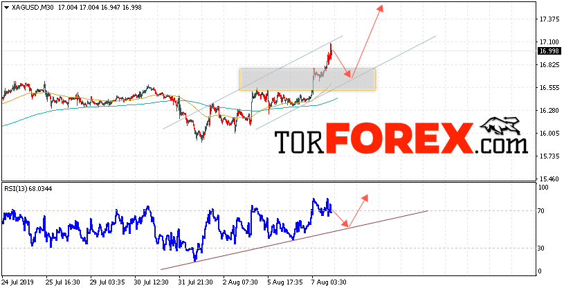 В пользу роста котировок XAG/USD выступит тест линии поддержки на индикаторе относительной силы. Вторым сигналом станет отскок от нижней границы восходящего канала. Отменой варианта роста цен на Серебро 8 августа 2019 станет падение и пробой 16.35. Это укажет на пробой нижней границы восходящего канала и продолжение падения в область ниже уровня 15.35. Ожидать ускорения роста котировок XAG/USD стоит с пробоем области сопротивления и закрытием над уровнем 17.25.