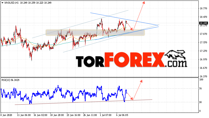 Дополнительным сигналом в пользу подъёма котировок и цен на Серебро XAG/USD выступит тест линии поддержки на индикаторе относительной силы. Вторым сигналом в пользу роста станет отскок от нижней границы восходящего канала. Отменой варианта роста цен на Серебро 8 июля 2020 станет падение и пробой 17.55. Это укажет на пробой области поддержки и продолжение падения в область ниже уровня 16.65. Ожидать ускорения роста котировок XAG/USD стоит с пробоем области сопротивления и закрытием цен над уровнем 18.65, что укажет на пробой верхней границы модели «Треугольник».