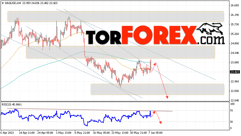 Дополнительным сигналом в пользу снижения котировок и цен на Серебро XAG/USD выступит тест линии сопротивления на индикаторе относительной силы (RSI). Вторым сигналом в пользу падения станет отскок от верхней границы медвежьего канала. Отменой варианта снижения цен на Серебро 8 июня 2023 станет сильный рост и пробой 24.45. Это укажет на пробой области сопротивления и продолжение роста в область выше уровня 26.75. Ожидать ускорения падения котировок XAG/USD стоит с пробоем области поддержки и закрытием цены под уровнем 22.95.