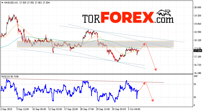 В пользу снижения котировок и цен на Серебро XAG/USD выступит тест пробитой линии поддержки на индикаторе относительной силы. Вторым сигналом в пользу подъёма станет отскок от верхней границы нисходящего канала. Отменой варианта падения цен на Серебро 8 октября 2019 станет сильный рост и пробой 18.60. Это укажет на пробой верхней границы нисходящего канала и продолжение подъёма в область выше уровня 19.90. Ожидать ускорения падения котировок XAG/USD стоит с пробоем области поддержки и закрытием под уровнем 17.05.