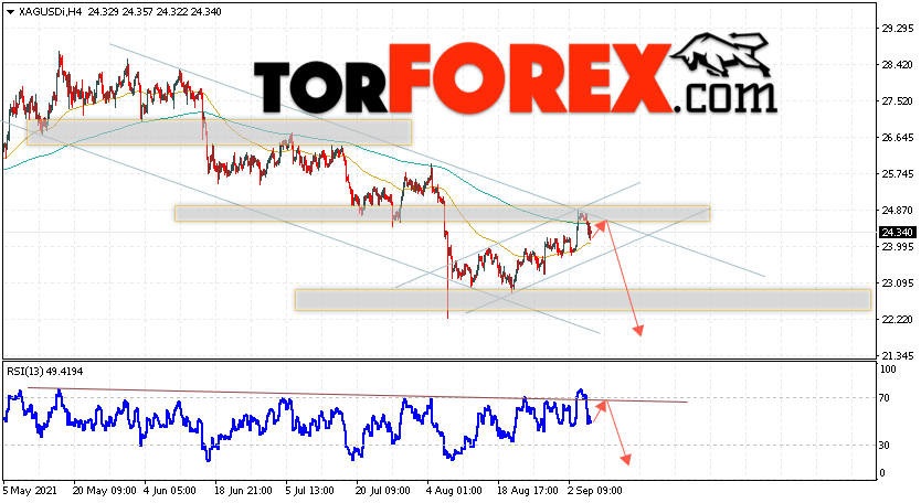 Дополнительным сигналом в пользу падения котировок и цен на Серебро XAG/USD выступит тест линии тренда на индикаторе относительной силы (RSI). Вторым сигналом в пользу снижения станет отскок от верхней границы нисходящего канала. Отменой варианта падения цен на Серебро 8 сентября 2021 станет сильный рост и пробой 25.65. Это укажет на пробой области сопротивления и продолжение подъёма в область выше уровня 27.45. Ожидать ускорения падения котировок XAG/USD стоит с пробоем области поддержки и закрытием цены под уровнем 23.15.