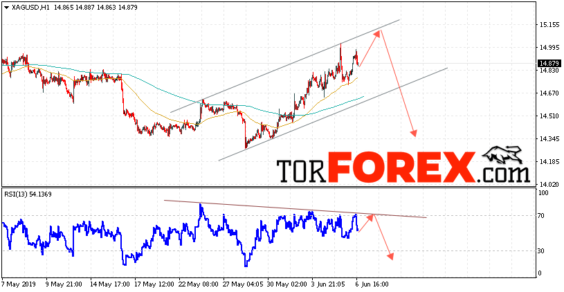 В пользу подъёма котировок XAG/USD выступит тест нисходящей линии тренда на индикаторе относительной силы. Вторым сигналом станет отскок от верхней границы восходящего канала. Отменой варианта снижения цен на Серебро 7 июня 2019 станет сильный рост и пробой 15.25. Это укажет на пробой верхней границы канала и продолжение роста в область выше уровня 15.75. Ожидать ускорения падения котировок XAG/USD стоит с пробоем нижней границы восходящего канала и закрытием ниже уровня 14.50.