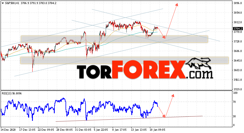 Таким образом, S&P 500 прогноз и аналитика на 20 января 2021 предполагает попытку теста уровня поддержки вблизи области 3705. Затем, продолжение роста в область выше уровня 4005. В пользу снижения котировок S&P 500 выступит тест линии тренда на индикаторе относительной силы. Отменой варианта подъёма станет падение стоимости индекса и пробой области 3525. Это укажет на продолжение снижения с целью ниже области 3405.