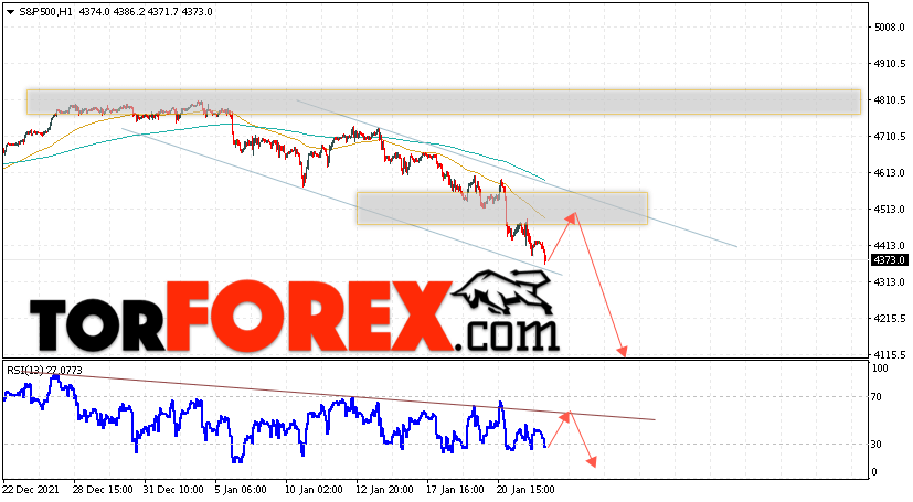 Таким образом, S&P 500 прогноз и аналитика на 25 января 2022 предполагает попытку теста уровня сопротивления вблизи области 4505. Затем, продолжение падения в область ниже уровня 4115. В пользу снижения котировок S&P 500 выступит тест линии тренда на индикаторе относительной силы. Отменой варианта падения станет сильный рост стоимости индекса и пробой области 4635. Это укажет на продолжение снижения с целью подъёма области 4855.