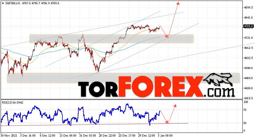 Таким образом, S&P 500 прогноз и аналитика на 4 января 2022 предполагает попытку теста уровня поддержки вблизи области 4725. Затем, продолжение роста в область выше уровня 4925. В пользу подъёма котировок S&P 500 выступит тест линии тренда на индикаторе относительной силы. Отменой варианта роста станет падение стоимости индекса и пробой области 4615. Это укажет на продолжение снижения с целью ниже области 4505.