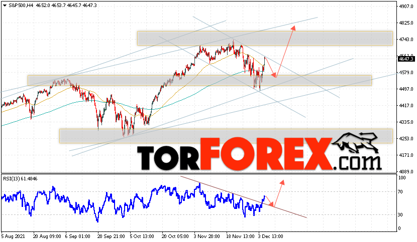 Таким образом, S&P 500 прогноз и аналитика на 8 декабря 2021 предполагает попытку теста уровня поддержки вблизи области 4565. Затем, продолжение роста в область выше уровня 4825. В пользу подъёма котировок S&P 500 выступит тест линии тренда на индикаторе относительной силы. Отменой варианта роста станет падение стоимости индекса и пробой области 4445. Это укажет на продолжение снижения с целью ниже области 4255.