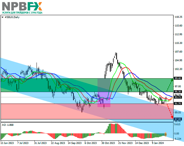 Длинные позиции можно открывать после роста и закрепления цены выше уровня 95.30 с целью 99.40. Стоп-лосс — 94.00. Срок реализации: 7 дней и более.