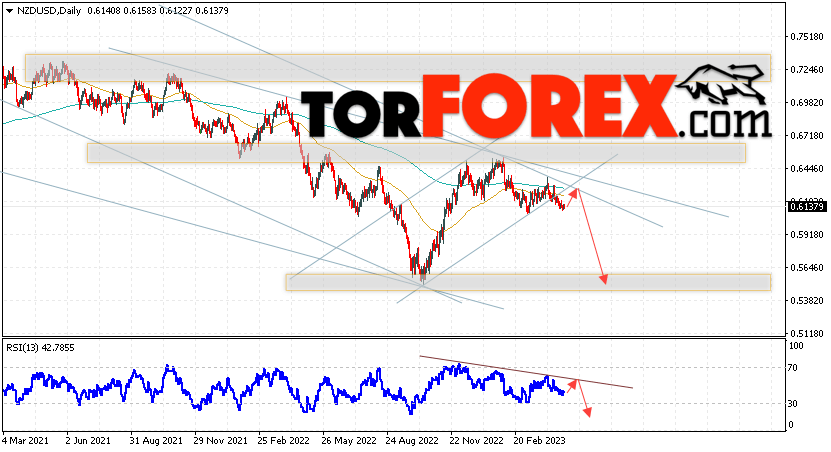 Дополнительным сигналом в пользу падения валютной пары NZD/USD выступит тест нисходящей линии тренда на индикаторе относительной силы. Вторым сигналом станет отскок от верхней границы нисходящего канала. Отменой варианта падения котировок пары на текущей торговой неделе 1 — 5 мая 2023 станет сильный рост и пробой области 0.6545. Это укажет на пробой области сопротивления и продолжение подъёма пары NZD/USD с потенциальной целью выше уровня 0.6785. Подтверждением падения валютной пары на Форекс выступит пробой области поддержки и закрытие котировок ниже области 0.6065.