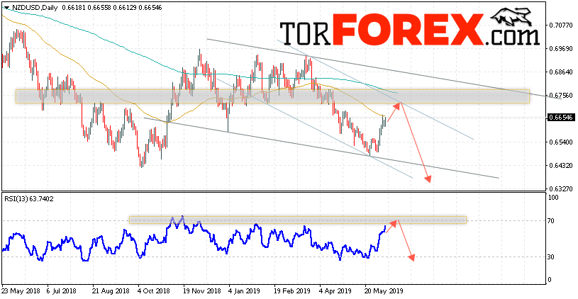 В пользу падения валютной пары NZD/USD выступит тест области сопротивления на индикаторе относительной силы. Вторым сигналом станет отскок от верхней границы нисходящего канала. Отменой варианта падения котировок на текущей торговой неделе 10 — 14 июня 2019 станет сильный рост и пробой области 0.6785. Это укажет на пробой верхней границы нисходящего канала и продолжение подъёма пары NZD/USD. Подтверждением снижение валютной пары на Форекс выступит пробой области поддержки и закрытие котировок ниже области 0.6575.
