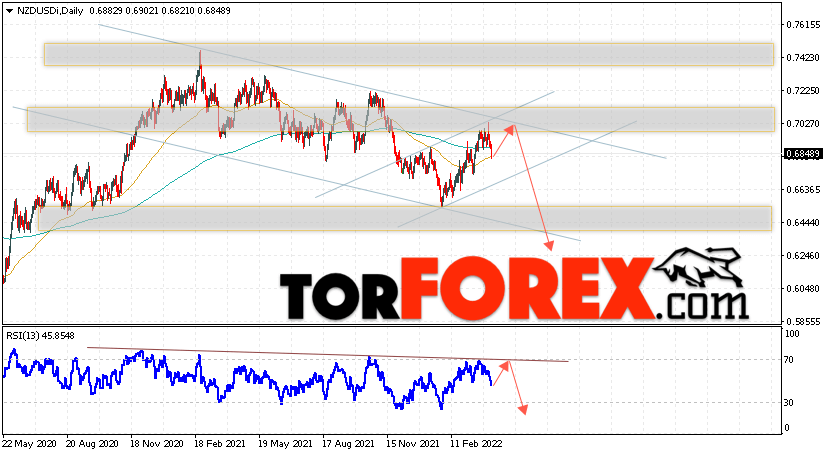 Дополнительным сигналом в пользу падения валютной пары NZD/USD выступит тест линии тренда на индикаторе относительной силы. Вторым сигналом станет отскок от верхней границы нисходящего канала. Отменой варианта падения котировок пары на текущей торговой неделе 11 — 15 апреля 2022 станет сильный рост и пробой области 0.7235. Это укажет на пробой области сопротивления и продолжение подъёма пары NZD/USD с потенциальной целью выше уровня 0.7645. Подтверждением падения валютной пары на Форекс выступит пробой области поддержки и закрытие котировок ниже области 0.6605, что укажет на пробой нижней границы восходящего канала.