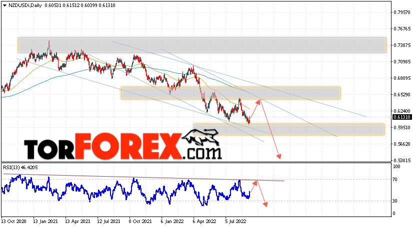 Дополнительным сигналом в пользу падения валютной пары NZD/USD выступит тест нисходящей линии тренда на индикаторе относительной силы. Вторым сигналом станет отскок от верхней границы нисходящего канала. Отменой варианта падения котировок пары на текущей торговой неделе 12 — 16 сентября 2022 станет сильный рост и пробой области 0.6645. Это укажет на пробой области сопротивления и продолжение подъёма пары NZD/USD с потенциальной целью выше уровня 0.6985. Подтверждением падения валютной пары на Форекс выступит пробой области поддержки и закрытие котировок ниже области 0.6005, что укажет на пробой нижней границы канала.