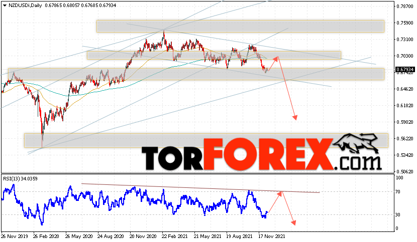Дополнительным сигналом в пользу падения валютной пары NZD/USD выступит тест линии тренда на индикаторе относительной силы. Вторым сигналом станет отскок от нижней границы бычьего канала. Отменой варианта падения котировок пары на текущей торговой неделе 13 — 17 декабря 2021 станет сильный рост и пробой области 0.7295. Это укажет на пробой области сопротивления и продолжение подъёма пары NZD/USD с потенциальной целью выше уровня 0.7595. Подтверждением падения валютной пары на Форекс выступит пробой области поддержки и закрытие котировок ниже области 0.6505, что укажет на пробой нижней границы нисходящего канала, а это сигнальный сигнал к продажам.