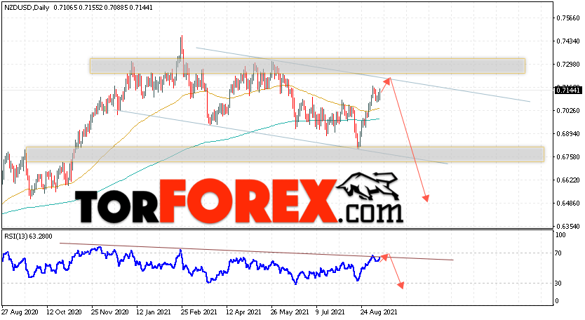Дополнительным сигналом в пользу падения валютной пары NZD/USD выступит тест линии нисходящей тренда на индикаторе относительной силы. Вторым сигналом станет отскок от верхней границы нисходящего канала. Отменой варианта падения котировок пары на текущей торговой неделе 13 — 17 сентября 2021 станет сильный рост и пробой области 0.7355. Это укажет на пробой области сопротивления и продолжение подъёма пары NZD/USD с потенциальной целью выше уровня 0.7785. Подтверждением падения валютной пары на Форекс выступит пробой области поддержки и закрытие котировок ниже области 0.6955.