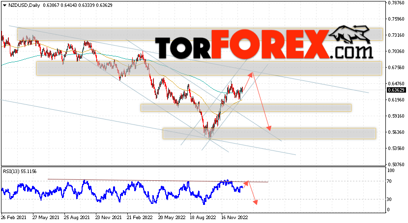 Дополнительным сигналом в пользу падения валютной пары NZD/USD выступит тест нисходящей линии тренда на индикаторе относительной силы. Вторым сигналом станет отскок от верхней границы нисходящего канала. Отменой варианта падения котировок пары на текущей торговой неделе 16 — 20 января 2023 станет сильный рост и пробой области 0.6865. Это укажет на пробой области сопротивления и продолжение подъёма пары NZD/USD с потенциальной целью выше уровня 0.7275. Подтверждением падения валютной пары на Форекс выступит пробой области поддержки и закрытие котировок ниже области 0.6145, что укажет на пробой нижней границы бычьего канала коррекции.
