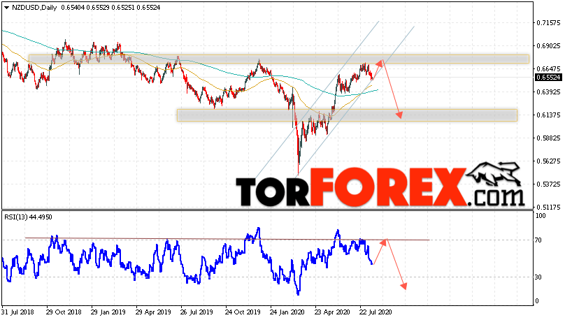 Дополнительным сигналом в пользу падения валютной пары NZD/USD выступит тест области сопротивления на индикаторе относительной силы. Вторым сигналом станет формирование разворотной модели перевёрнутая «Голова и плечи». Отменой варианта падения котировок на текущей торговой неделе неделю 17 — 21 августа 2020 станет сильный рост и пробой области 0.6915. Это укажет на пробой области сопротивления и продолжение роста пары NZD/USD с потенциальной целью выше уровня 0.7325. Подтверждением падения валютной пары на Форекс выступит пробой области поддержки и закрытие котировок ниже области 0.6375, что укажет на пробой нижней границы восходящего канала.