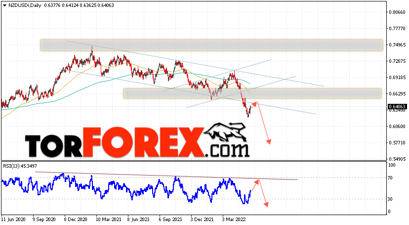 Дополнительным сигналом в пользу падения валютной пары NZD/USD выступит тест линии тренда на индикаторе относительной силы. Вторым сигналом станет отскок от нижней границы медвежьего канала, это сильный сигнал в пользу продаж. Отменой варианта падения котировок пары на текущей торговой неделе 23 — 27 мая 2022 станет сильный рост и пробой области 0.6635. Это укажет на пробой области сопротивления и продолжение подъёма пары NZD/USD с потенциальной целью выше уровня 0.7345. Подтверждением падения валютной пары на Форекс выступит пробой области поддержки и закрытие котировок ниже области 0.6185.