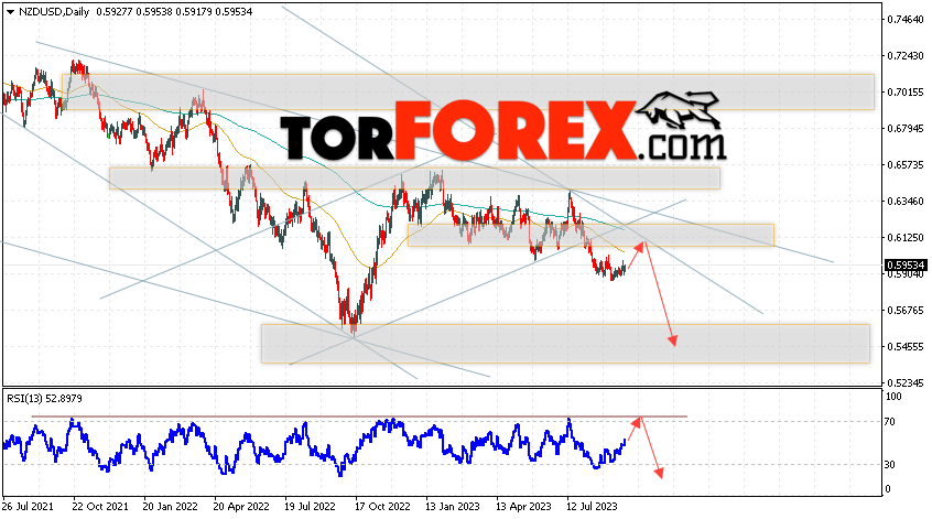 Дополнительным сигналом в пользу падения валютной пары NZD/USD выступит тест нисходящей линии тренда на индикаторе относительной силы. Вторым сигналом станет отскок от верхней границы нисходящего канала. Отменой варианта падения котировок пары на текущей торговой неделе 25 — 29 сентября 2023 станет сильный рост и пробой области 0.6365. Это укажет на пробой области сопротивления и продолжение подъёма пары NZD/USD с потенциальной целью выше уровня 0.6745. Подтверждением падения валютной пары на Форекс выступит пробой области поддержки и закрытие котировок ниже области 0.5865.
