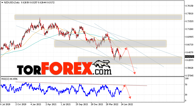 Дополнительным сигналом в пользу падения валютной пары NZD/USD выступит тест линии тренда на индикаторе относительной силы. Вторым сигналом станет отскок от верхней границы медвежьего канала. Отменой варианта падения котировок пары на текущей торговой неделе 27 июня — 1 июля 2022 станет сильный рост и пробой области 0.6905. Это укажет на пробой области сопротивления и продолжение подъёма пары NZD/USD с потенциальной целью выше уровня 0.7335. Подтверждением падения валютной пары на Форекс выступит пробой области поддержки и закрытие котировок ниже области 0.6045, что укажет на пробой нижней границы нисходящего канала.