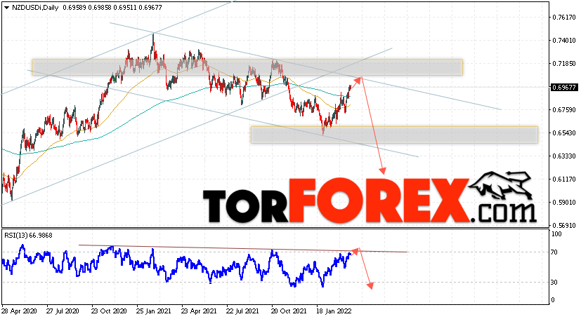 Дополнительным сигналом в пользу падения валютной пары NZD/USD выступит тест линии тренда на индикаторе относительной силы. Вторым сигналом станет отскок от верхней границы нисходящего канала. Отменой варианта падения котировок пары на текущей торговой неделе 28 марта — 1 апреля 2022 станет сильный рост и пробой области 0.7185. Это укажет на пробой области сопротивления и продолжение подъёма пары NZD/USD с потенциальной целью выше уровня 0.7495. Подтверждением падения валютной пары на Форекс выступит пробой области поддержки и закрытие котировок ниже области 0.6705.