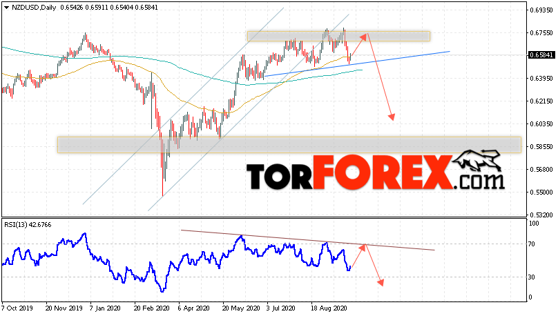 Дополнительным сигналом в пользу падения валютной пары NZD/USD выступит тест линии сопротивления на индикаторе относительной силы. Вторым сигналом станет формирование разворотной модели ”Голова и плечи”. Отменой варианта падения котировок на текущей торговой неделе 28 сентября — 2 октября 2020 станет сильный рост и пробой области 0.6950. Это укажет на пробой области сопротивления и продолжение роста пары NZD/USD с потенциальной целью выше уровня 0.7355. Подтверждением падения валютной пары на Форекс выступит пробой области поддержки и закрытие котировок ниже области 0.6395, что укажет на пробой нижний границы модели ”Голова и плечи” и начала ее отработки.