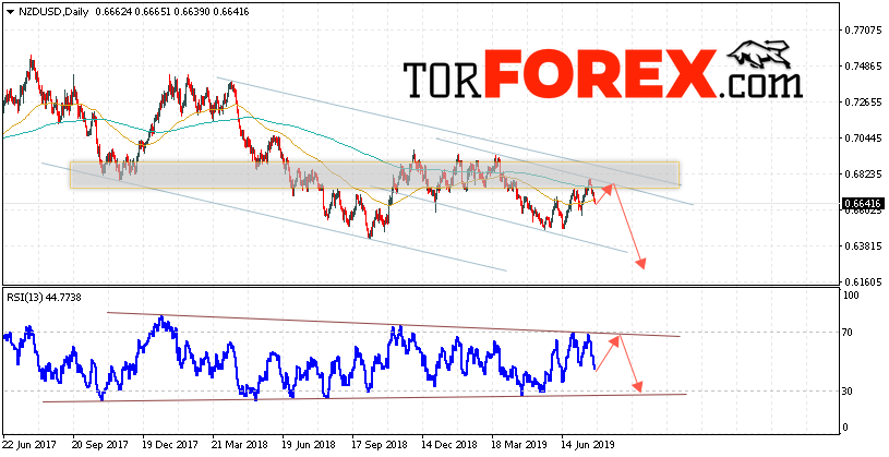 В пользу падения валютной пары NZD/USD выступит тест нисходящей линии сопротивления на индикаторе относительной силы. Вторым сигналом станет отскок от верхней границы нисходящего канала. Отменой варианта падения котировок на текущей торговой неделе 29 июля — 2 августа 2019 станет сильный рост и пробой области 0.6965. Это укажет на пробой верхней границы нисходящего канала и продолжение подъёма пары NZD/USD с потенциальной целью выше уровня 0.7245. Подтверждением снижение валютной пары на Форекс выступит пробой области поддержки и закрытие котировок ниже области 0.6535.