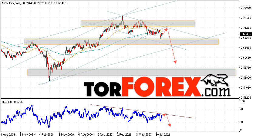 Дополнительным сигналом в пользу падения валютной пары NZD/USD выступит тест линии нисходящей тренда на индикаторе относительной силы. Вторым сигналом станет отскок от нижней границы бычьего канала. Отменой варианта падения котировок пары на текущей торговой неделе 30 августа — 3 сентября 2021 станет сильный рост и пробой области 0.7325. Это укажет на пробой области сопротивления и продолжение подъёма пары NZD/USD с потенциальной целью выше уровня 0.7695. Подтверждением падения валютной пары на Форекс выступит пробой области поддержки и закрытие котировок ниже области 0.6685.