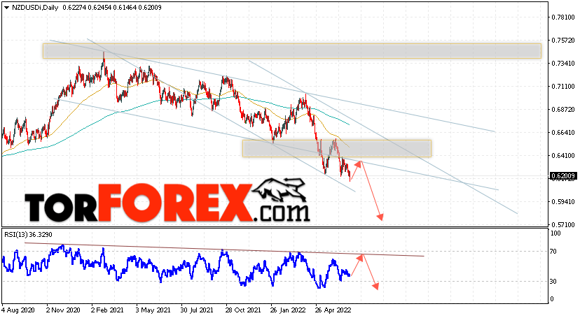 Дополнительным сигналом в пользу падения валютной пары NZD/USD выступит тест линии тренда на индикаторе относительной силы. Вторым сигналом станет отскок от нижней границы медвежьего канала. Отменой варианта падения котировок пары на текущей торговой неделе 4 — 8 июля 2022 станет сильный рост и пробой области 0.6705. Это укажет на пробой области сопротивления и продолжение подъёма пары NZD/USD с потенциальной целью выше уровня 0.7025. Подтверждением падения валютной пары на Форекс выступит пробой области поддержки и закрытие котировок ниже области 0.6075.