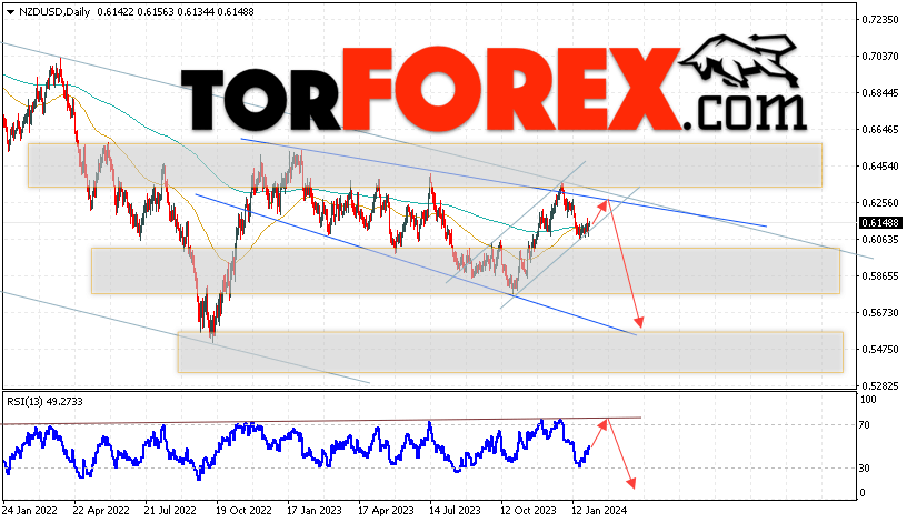 Дополнительным сигналом в пользу падения валютной пары NZD/USD выступит тест нисходящей линии тренда на индикаторе относительной силы. Вторым сигналом станет отскок от верхней границы нисходящего канала. Отменой варианта падения котировок пары на текущей торговой неделе 5 — 9 февраля 2024 станет сильный рост и пробой области 0.6465. Это укажет на пробой области сопротивления и продолжение подъёма пары NZD/USD с потенциальной целью выше уровня 0.6775. Подтверждением падения валютной пары на Форекс выступит пробой области поддержки и закрытие котировок ниже области 0.6025, что укажет на пробой нижней границы бычьего канала коррекции.