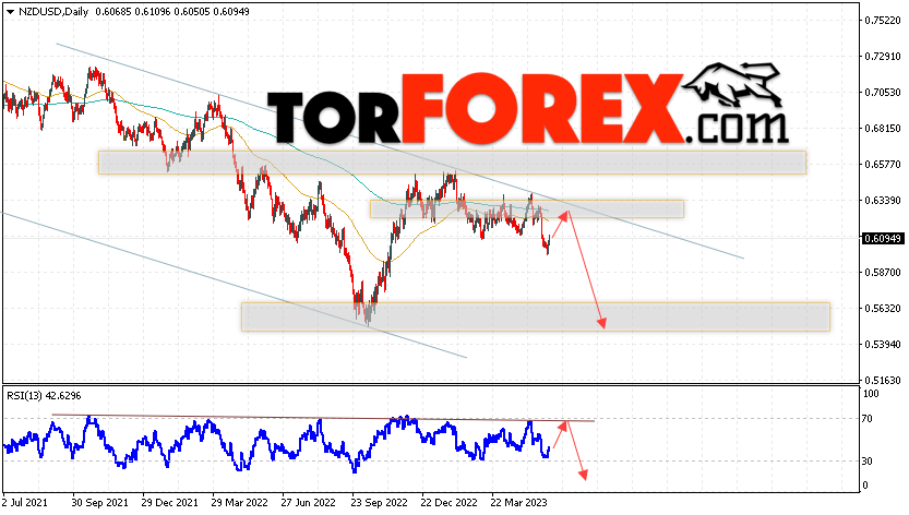 Дополнительным сигналом в пользу падения валютной пары NZD/USD выступит тест нисходящей линии тренда на индикаторе относительной силы. Вторым сигналом станет отскок от верхней границы нисходящего канала. Отменой варианта падения котировок пары на текущей торговой неделе 5 — 9 июня 2023 станет сильный рост и пробой области 0.6475. Это укажет на пробой области сопротивления и продолжение подъёма пары NZD/USD с потенциальной целью выше уровня 0.6875. Подтверждением падения валютной пары на Форекс выступит пробой области поддержки и закрытие котировок ниже области 0.5875.