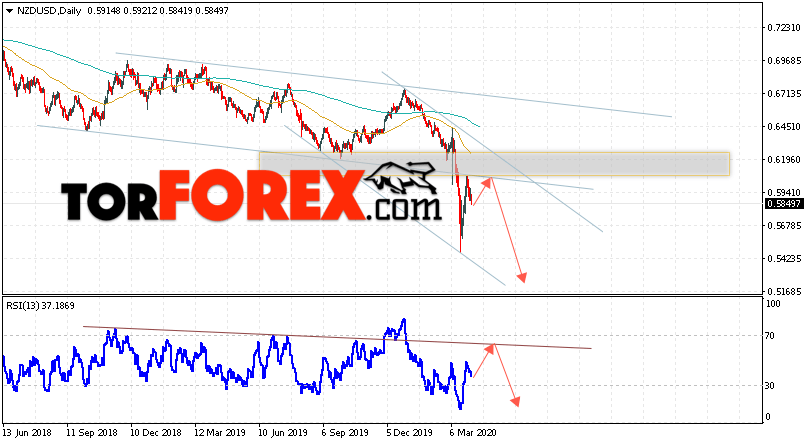 В пользу падения валютной пары NZD/USD выступит тест линии сопротивления на индикаторе относительной силы. Вторым сигналом станет отскок от нижней границы нисходящего канала. Отменой варианта падения котировок на текущей торговой неделе неделю 6 — 10 апреля 2020 станет сильный рост и пробой области 0.6205. Это укажет на пробой области сопротивления и продолжение роста пары NZD/USD с потенциальной целью выше уровня 0.6565. Подтверждением падения валютной пары на Форекс выступит пробой области поддержки и закрытие котировок ниже области 0.5535.