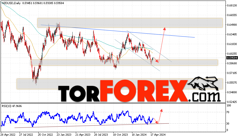 Дополнительным сигналом в пользу роста валютной пары NZD/USD выступит тест бычьей линии тренда на индикаторе относительной силы. Вторым сигналом станет отскок от нижней границы разворотной модели «Голова и плечи». Отменой варианта подъёма котировок пары на текущей торговой неделе 6 — 10 мая 2024 станет падение и пробой области 0.5705. Это укажет на пробой области поддержки и продолжение падения пары NZD/USD с потенциальной целью ниже уровня 0.5495. Подтверждением росту валютной пары на Форекс выступит пробой области сопротивления и закрытие котировок выше области 0.6175, что укажет на пробой верхней границы нисходящего канала коррекции.