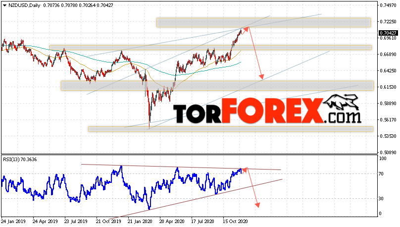Дополнительным сигналом в пользу падения валютной пары NZD/USD выступит тест линии тренда на индикаторе относительной силы. Вторым сигналом станет отскок от важной области сопротивления на графике цены. Отменой варианта падения котировок на текущей торговой неделе 7 — 11 декабря 2020 станет сильный рост и пробой области 0.7235. Это укажет на пробой области сопротивления и продолжение роста пары NZD/USD с потенциальной целью выше уровня 0.7565. Подтверждением падения валютной пары на Форекс выступит пробой области поддержки и закрытие котировок ниже области 0.6675.