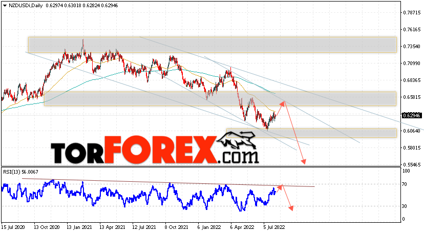 Дополнительным сигналом в пользу падения валютной пары NZD/USD выступит тест линии тренда на индикаторе относительной силы. Вторым сигналом станет отскок от верхней границы медвежьего канала. Отменой варианта падения котировок пары на текущей торговой неделе 8 — 12 августа 2022 станет сильный рост и пробой области 0.6805. Это укажет на пробой области сопротивления и продолжение подъёма пары NZD/USD с потенциальной целью выше уровня 0.7075. Подтверждением падения валютной пары на Форекс выступит пробой области поддержки и закрытие котировок ниже области 0.5865, что укажет на пробой нижней границы нисходящего канала, а это сигнал к падению на ширину канала.