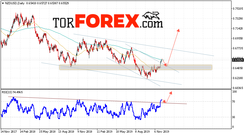 В пользу роста валютной пары NZD/USD выступит тест пробитой линии поддержки на индикаторе относительной силы. Вторым сигналом станет отскок от верхней границы нисходящего канала. Отменой варианта роста котировок на текущей торговой неделе неделю 9 — 13 декабря 2019 станет падение и пробой области 0.6235. Это укажет на пробой области поддержки и продолжение падения пары NZD/USD с потенциальной целью ниже уровня 0.6005. Подтверждением роста валютной пары на Форекс выступит пробой верхней границы нисходящего канала и закрытие котировок выше области 0.6805.