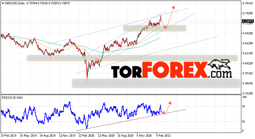 Дополнительным сигналом в пользу роста валютной пары NZD/USD выступит тест линии тренда на индикаторе относительной силы. Вторым сигналом станет отскок от нижней границы восходящего канала. Отменой варианта роста котировок на текущей торговой неделе 1 — 5 марта 2021 станет падение и пробой области 0.6865. Это укажет на пробой области поддержки и продолжение падения пары NZD/USD с потенциальной целью ниже уровня 0.6345. Подтверждением роста валютной пары на Форекс выступит пробой области сопротивления и закрытие котировок выше области 0.7565.