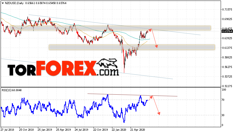 Дополнительным сигналом в пользу падения валютной пары NZD/USD выступит тест области сопротивления на индикаторе относительной силы. Вторым сигналом станет формирование разворотной модели перевернутая «Голова и плечи». Отменой варианта падения котировок на текущей торговой неделе неделю 13 — 17 июля 2020 станет сильный рост и пробой области 0.6855. Это укажет на пробой области сопротивления и продолжение роста пары NZD/USD с потенциальной целью выше уровня 0.7265. Подтверждением падения валютной пары на Форекс выступит пробой области поддержки и закрытие котировок ниже области 0.6225.