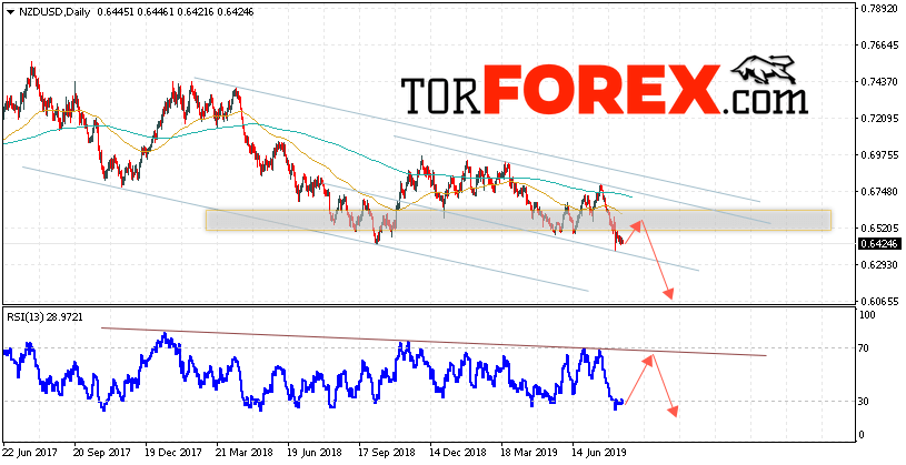 В пользу падения валютной пары NZD/USD выступит тест нисходящей линии сопротивления на индикаторе относительной силы. Вторым сигналом станет отскок от верхней границы нисходящего канала. Отменой варианта падения котировок на текущей торговой неделе 19 — 23 августа 2019 станет сильный рост и пробой области 0.6755. Это укажет на пробой верхней границы нисходящего канала и продолжение подъёма пары NZD/USD с потенциальной целью выше уровня 0.7065. Подтверждением снижение валютной пары на Форекс выступит пробой области поддержки и закрытие котировок ниже области 0.6275.