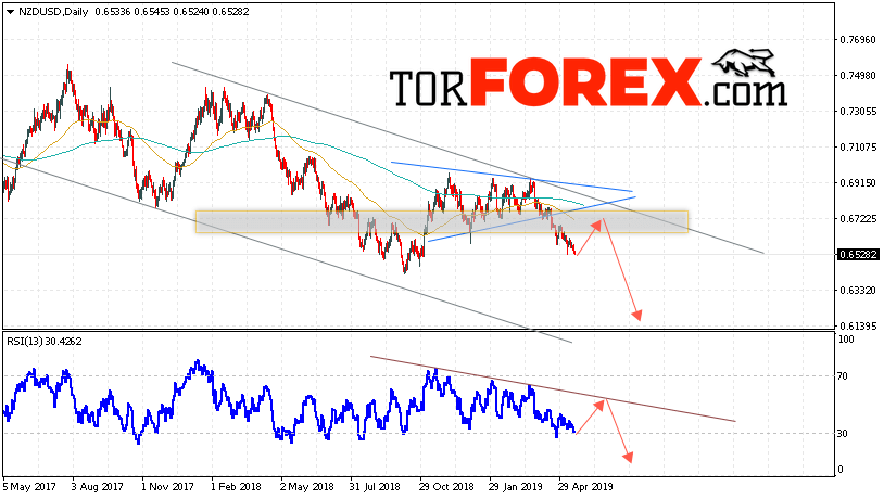 В пользу падения валютной пары NZD/USD выступит тест нисходящей линии тренда на индикаторе относительной силы. Вторым сигнальном станет отскок от нижней границы модели «Треугольник». Отменой варианта падения котировок на текущей торговой неделе 20 — 24 мая 2019 станет сильный рост и пробой области 0.6925. Это укажет на пробой верхней границы нисходящего канала и продолжение роста пары NZD/USD. Подтверждением снижение валютной пары на Форекс выступит пробой области поддержки и закрытие котировок ниже области 0.6475.