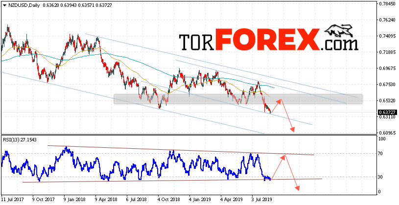 В пользу падения валютной пары NZD/USD выступит тест нисходящей линии сопротивления на индикаторе относительной силы. Вторым сигналом станет отскок от верхней границы нисходящего канала. Отменой варианта падения котировок на текущей торговой неделе 26 — 30 августа 2019 станет сильный рост и пробой области 0.6755. Это укажет на пробой верхней границы нисходящего канала и продолжение подъёма пары NZD/USD с потенциальной целью выше уровня 0.7065. Подтверждением снижение валютной пары на Форекс выступит пробой нижней границы нисходящего канала и закрытие котировок ниже области 0.6235.