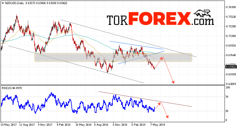 В пользу падения валютной пары NZD/USD выступит тест нисходящей линии тренда на индикаторе относительной силы. Вторым сигнальном станет отскок от нижней границы модели «Треугольник». Отменой варианта падения котировок на текущей торговой неделе 27 — 31 мая 2019 станет сильный рост и пробой области 0.6935. Это укажет на пробой верхней границы нисходящего канала и продолжение роста пары NZD/USD. Подтверждением снижение валютной пары на Форекс выступит пробой области поддержки и закрытие котировок ниже области 0.6475.