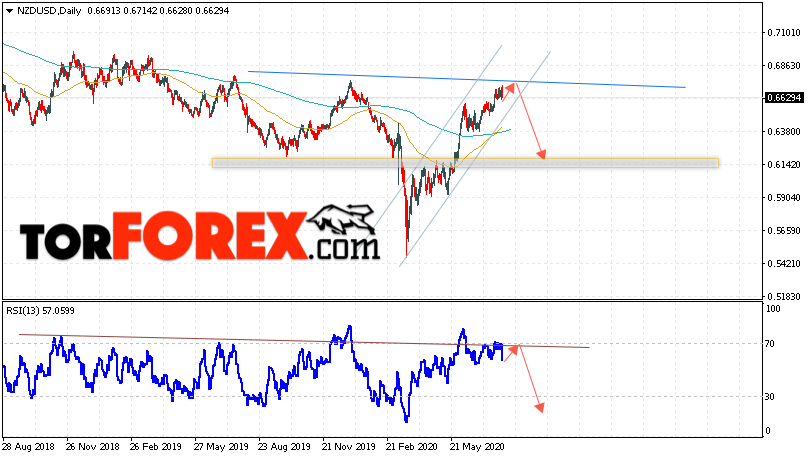 Дополнительным сигналом в пользу падения валютной пары NZD/USD выступит тест области сопротивления на индикаторе относительной силы. Вторым сигналом станет формирование разворотной модели перевернутая «Голова и плечи». Отменой варианта падения котировок на текущей торговой неделе неделю 3 — 7 августа 2020 станет сильный рост и пробой области 0.6895. Это укажет на пробой области сопротивления и продолжение роста пары NZD/USD с потенциальной целью выше уровня 0.7295. Подтверждением падения валютной пары на Форекс выступит пробой области поддержки и закрытие котировок ниже области 0.6365, что укажет на пробой нижнем границы восходящего канала.