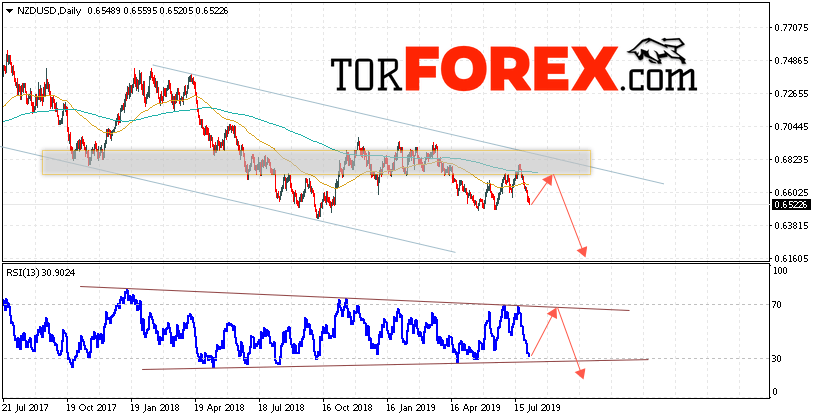 В пользу падения валютной пары NZD/USD выступит тест нисходящей линии сопротивления на индикаторе относительной силы. Вторым сигналом станет отскок от верхней границы нисходящего канала. Отменой варианта падения котировок на текущей торговой неделе 5 — 9 августа 2019 станет сильный рост и пробой области 0.6955. Это укажет на пробой верхней границы нисходящего канала и продолжение подъёма пары NZD/USD с потенциальной целью выше уровня 0.7245. Подтверждением снижение валютной пары на Форекс выступит пробой области поддержки и закрытие котировок ниже области 0.6395.