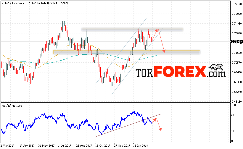 В пользу падения NZD/USD выступит тест пробитой линии тренда на индикаторе относительной силы. Отменой варианта падения станет сильный рост и пробой области 0.7550, что укажет на пробой области сопротивления и продолжение роста пары NZD/USD. Подтверждением снижения пары выступит пробой нижней границы канала и закрытие котировок ниже области 0.7240.
